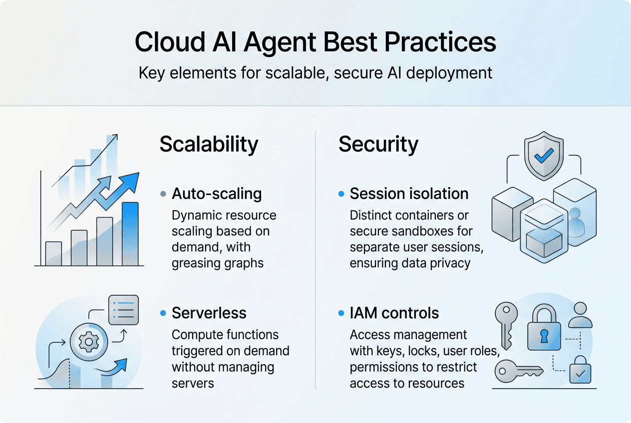 Providers implement session isolation through dedicated compute environments, preventing cross-contamination between user interactions. Identity controls enforce least-privilege access, ensuring agents operate only within authorized boundaries. Encryption protects data at rest and in transit, while compliance frameworks provide audit trails and governance controls. The cloud AI security and compliance guide details these layered defenses.