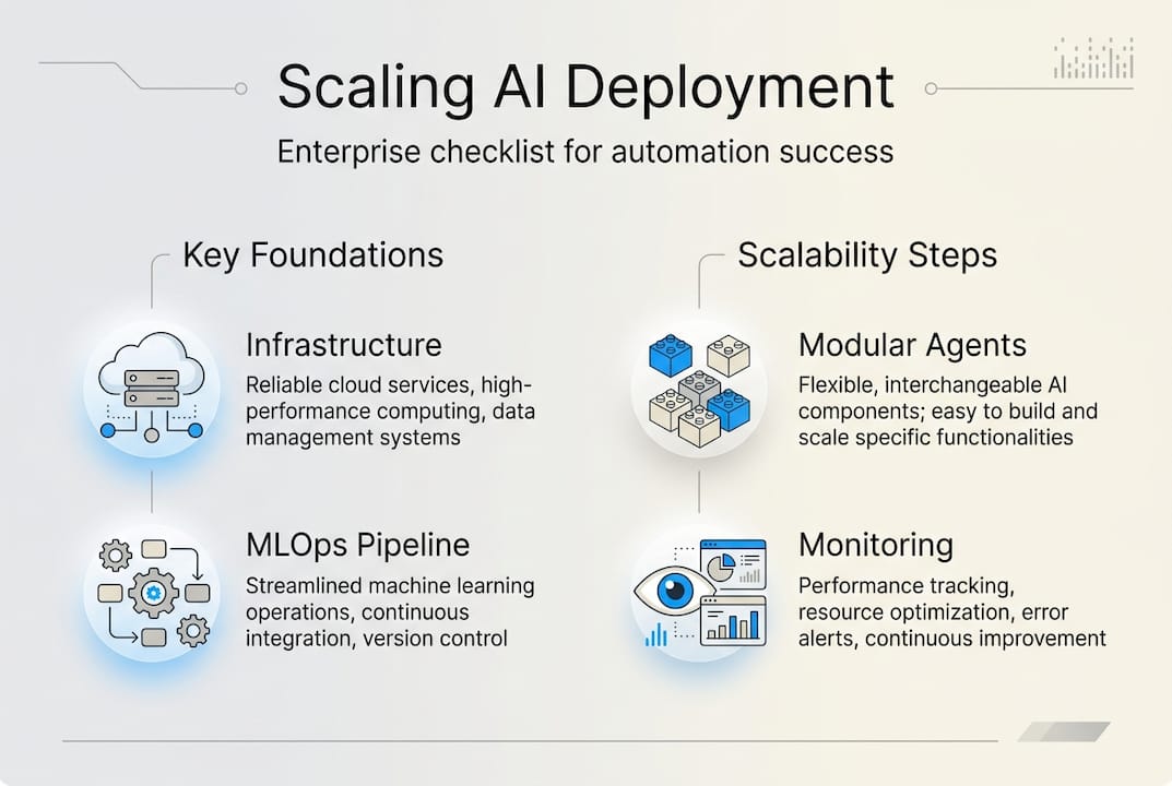 | Plan for scalability | Success with AI automation depends on robust infrastructure, skilled teams, and process readiness. |